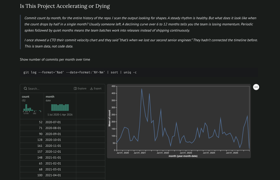 If you liked the post The Git Commands I Run Before Reading Any Code by Ally Piechowski, you might also like this interactive Marimo notebook that puts all those commands together and adds some nice charts.